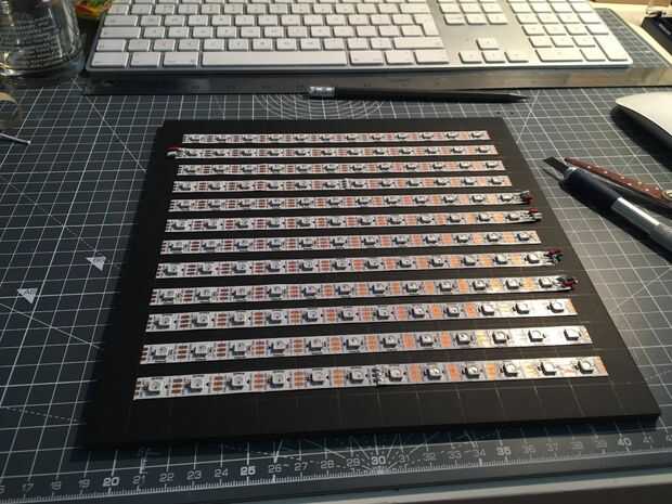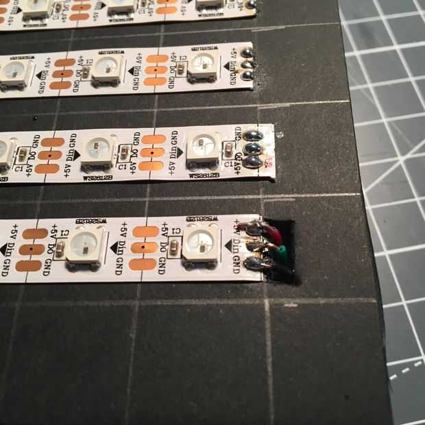 A continuación te soldar los contactos para hacer efectiva una tira de 144 LEDs. Si nos fijamos en la captura de pantalla de la hoja de cálculo, verás la dirección del LED de cada elemento en la matriz de LED. Más tarde, en el código, determinaremos que activar (set arriba (0,0,0)) y que apagar (juego a (0,0,0)).