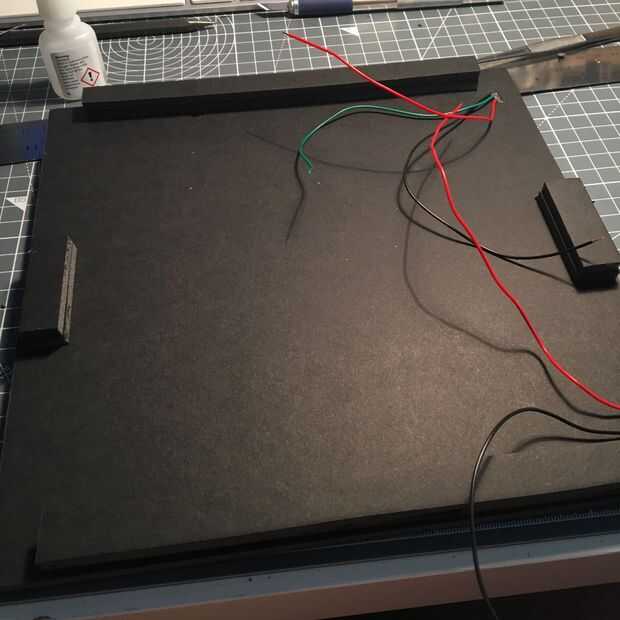 - Corte agujeros en la espuma tablero inferior derecho y superior derecho. Esto permite alimentar los 3 cables (5V +, datos, GND) a la parte inferior derecha y 2 cables (5V +, GND) superior derecha. La parte superior derecha actúa como un amplificador de potencia, por lo que la matriz no quede sin jugo cuando se viaja a través de 144 LEDs.