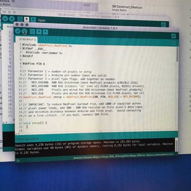 - Cargar el bosquejo de strandtest de Adafruit NeoPixel y cambiar la variable NUMPIXELS a 12