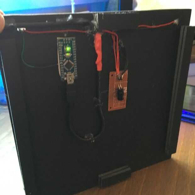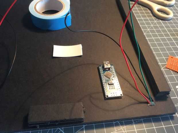 Siguiente trabajo después de las tiras LED se unen, es el Arduino. Montaje, lo alimentación y conexión de línea de datos a él. Montaje fue la parte fácil, una tira corta de acolchado cinta de doble cara. No hay ningún lugar adecuado para ponerlo, pero se vería basura si no es recto. Otra cosa a considerar es la posición del módulo de reloj en tiempo real que 'debe' ser como cerca de Arduino como sea posible para usted conseguir resultados precisos.