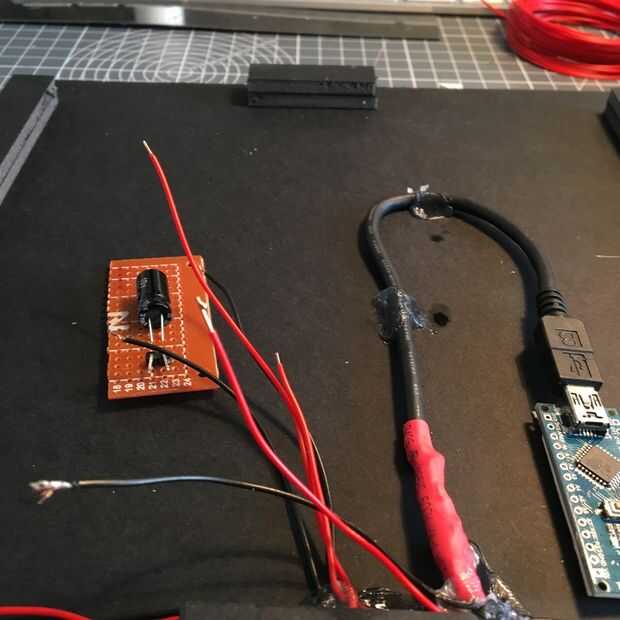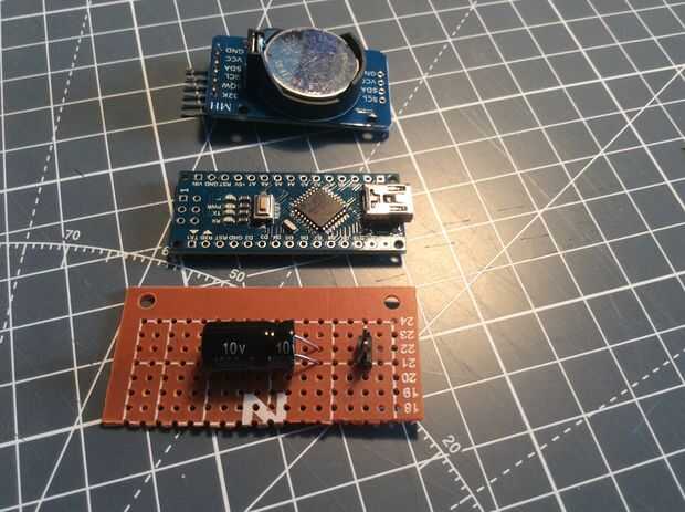 Si revisas las fotos, se ha montado en un tablero y doblada sobre. Por debajo de la Junta, se sueldan los pines del condensador a los terminales faston más adelante a soldar los 5V + y GND los cables de power, LEDs y reloj en tiempo real. Esta Junta estaba caliente pegado en lugar.