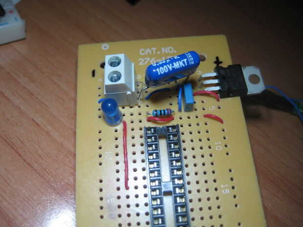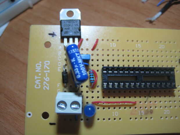 La alimentación de los LEDs no se toma de la salida regulada, sino directamente de los 9 V (cosa a tener en cuenta para calcular la resistencias debemos usar).