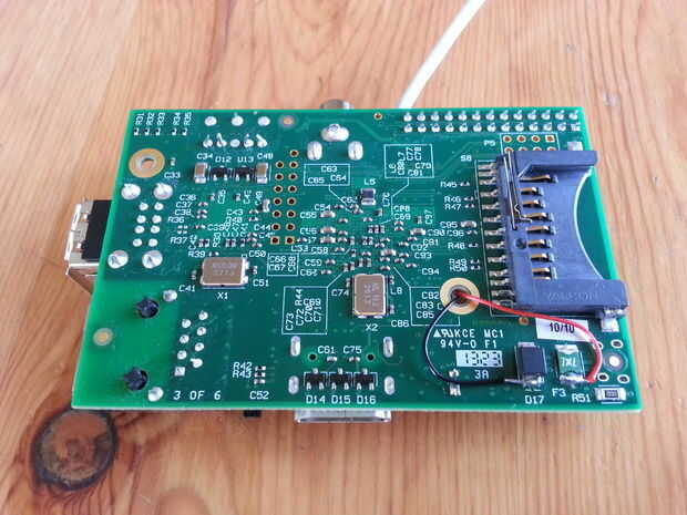 Por debajo de la placa Raspberry Pi, verá dos puntos de conexión con la etiqueta "D17" y "F3"