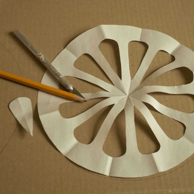 Es una manera fácil de hacer un círculo trazar la circunferencia de la tapa grande o tazón de fuente, utilicé un 8 1/2 pulgada de la tapa. Remontar la tapa sobre una hoja de papel para el patrón. El patrón de papel puede ser doblado y tratado como si fuera un pedazo de papel al hacer un copo de nieve de papel, pero el patrón no siempre resulta exacto debido a las capas de papel. Forma más precisa es cortar la forma deseada de un trozo de papel de desecho y rastro en los puntos exactos en el patrón.  Marcar un orificio central para el hilo del mecanismo del reloj. Luego cortar las formas interiores.