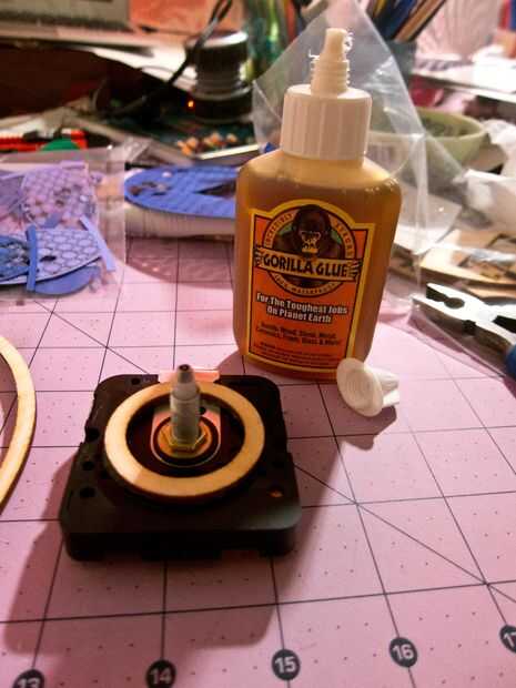 4. peso lo. Hay muchas maneras de aplicar el peso, pero el engranaje del reloj lo hace complicado. Mientras pegado me ha pasado a estar en una habitación que tenía un viejo peso circular, usé. Fue pura buena suerte. Suerte pura, bueno, tonto. A pesar de todo, creo que el pegamento gorila será suficiente sin el peso extra.