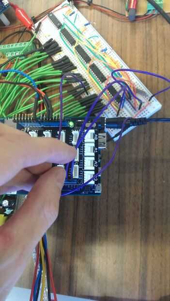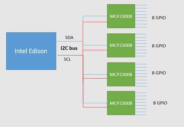 Tenemos un total de 33 salidas para controlar los 33 LEDs. Desde su muy útil utilizar 33 GPIO de Edison de la Intel, utiliza un expansor de puertos I2C (MCP23008 - hoja de datos en: http://ww1.microchip.com/downloads/en/DeviceDoc/21 ). También fue una buena oportunidad para probar la funcionalidad de I2C de la Edison de Intel. Conectamos 5 de los IC en un protoboard con un 3,3 v Fuente de alimentación. Hay 3 pines de dirección (A0, A1, A2) para dar cada IC una dirección i2c único. Después de Conecte el cable 2 del bus I2C con 2 cables (SDA y SCL) a la Edison de Intel. Su muy sencillo si utilizas la placa de E/S de Galileo de Intel, la bruja te puede conectar en el tablero de Edison para conectar al bus I2C (hay etiquetas en el tablero por lo que no tienes que mirar en las hojas de datos).