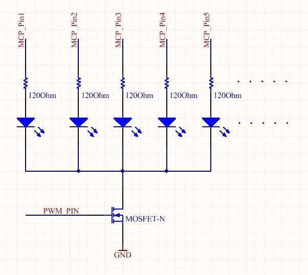 Conecte los LEDs de la placa según los esquemas que se muestra a continuación. Un resistor de 120 ohmios se conecta en serie a cada LED. Conecte todos los ánodos de lo LED a un N-MOSFET de conmutación con una corriente nominal > 1A y capaz es de 3.3V. La puerta está conectada a un pin PWM de la Edison de Intel. Este transistor se utiliza para cambiar el brillo de los LEDs. Si usted quiere entender por qué por favor, lea: