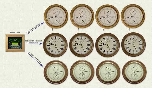Tiempo en la pantalla en grande 1"(26mm) displays 7 segmentos con secundaria pantalla de información LCD 4 x 20. El reloj se puede utilizar independiente o proporciona los siguientes pulsos para relojes auxiliares 1 seg alternando, 30 seg, 1 min, 1 hora, 24 h, 15 min campana de cuarto horas, repique de horas.
