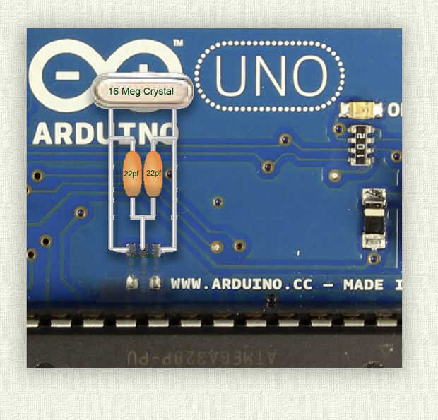 La pequeña parte a esta biblioteca es que necesita una hora exacta en el Arduino para bloquear en la frecuencia de DCF77. Placas Arduino moderno no utilizan un cristal de cuarzo (una que ves en el tablero es para el puerto serie) pero un resonador cerámico inferior de 16MHz. Udo ha escrito un programa de prueba para comprobar si tu Arduino tableros resonador de cristal hasta el trabajo de ejecutar su biblioteca y se puede encontrar aquí Alcance DCF77 . Si la placa no está hasta el trabajo es muy fácil quitar el resonador y reemplazarlo con un cristal de cuarzo y un par de condensadores. He modificado mi Arduino UNO y funciona perfectamente con la biblioteca.