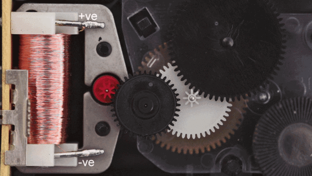 El segundo 1 movimiento (Foto 3) es impulsado por un motor paso a paso del tipo Lavet. El motor proviene de un movimiento de reloj de cuarzo con el tablero de control de cuarzo cortado. El motor requiere de corriente muy baja para manejarlo y puede conducir directo de la salida del Arduino a través de un resistor de trimmer. Sólo requiere un cambio de polaridad en el motor de paso en 1 segundo.