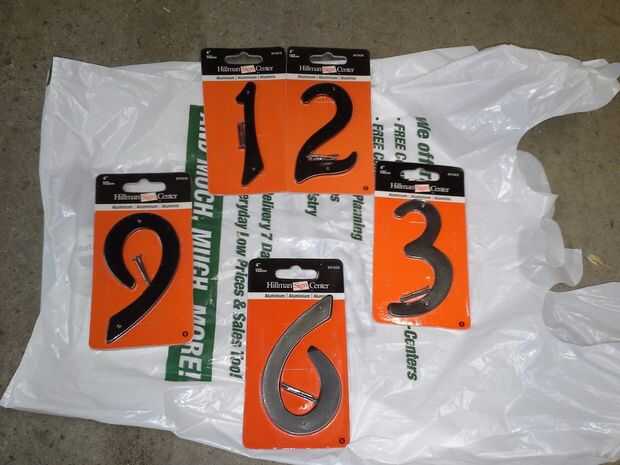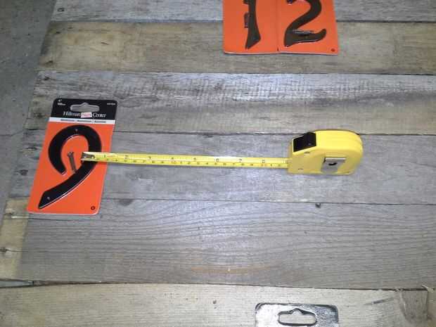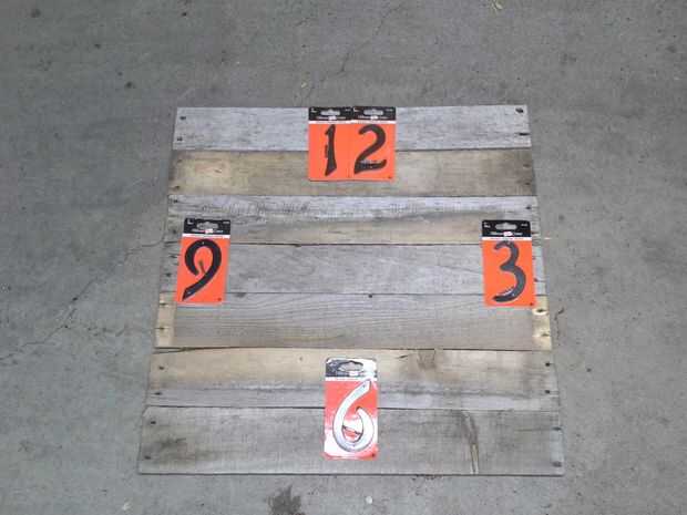 Al principio de este proyecto, estaba bastante seguro lo utilizaría para los números en la esfera del reloj. Entonces me golpeó esa casa de aluminio podrían trabajar números (para uso en casas o casillas de correo). Había dos o tres diversos tamaños y estilos en mi ferretería local y parecía que la opción más grande sólo funcionaría con el estilo de mi reloj, pero los números eran demasiado grandes para marcar cada hora. Entonces, me di cuenta que el reloj sería gran marca sólo las horas de 12, 3, 6 y 9. El tamaño de los números era ideal para esta aplicación e incluso pude encontrar algunos que ya vinieron en negro.