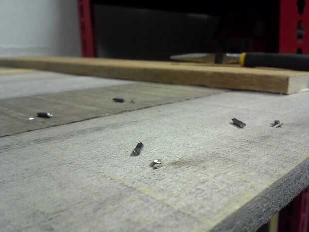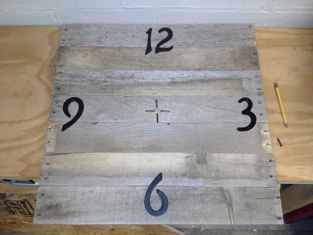 I utiliza el agujero central y bordes como referencia para marcar las ubicaciones de los números y luego clavó en su lugar. Usando una escuadra de carpintero, creado una plantilla con un ángulo de 30 grados para marcar la ubicación de los puntos de referencia el agujero central y los quemaron en.