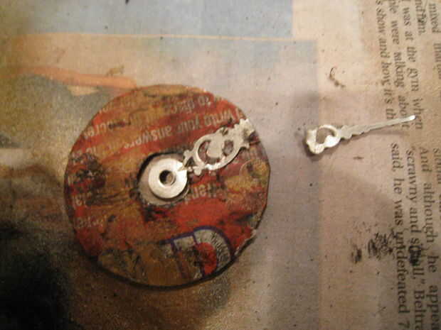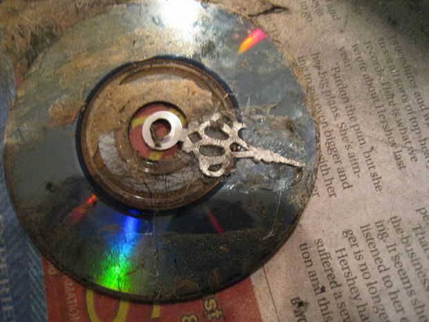 Para que la aguja de las horas, tomar la mano de hora retirar del mecanismo de y pegar la parte superior del mismo a la parte inferior de lo DVD más pequeño, como en el siguiente cuadro. Repita con el minutero en el disco de cartón. El minutero será probablemente más grande que el disco, así que lo recorte al tamaño.