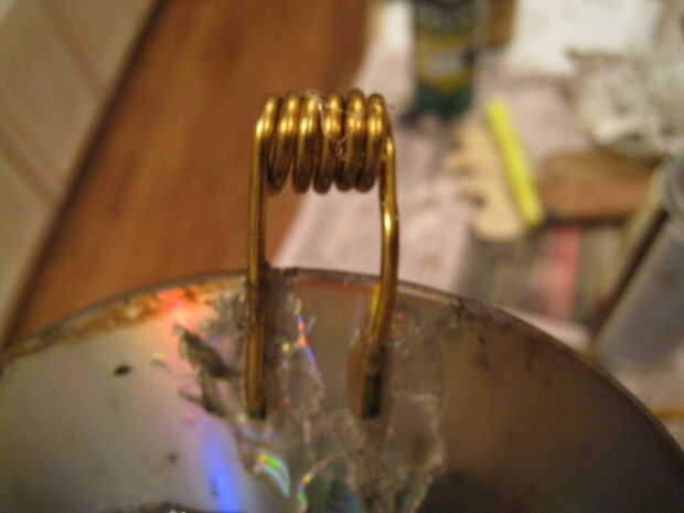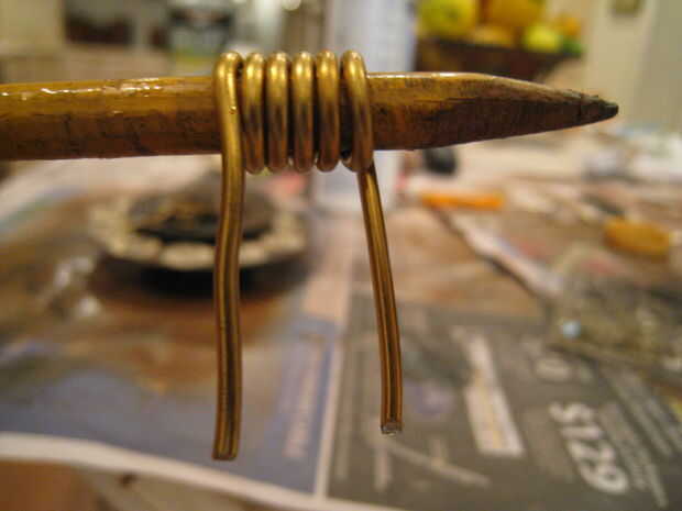 Tomar el alambre de bronce e Inicio bucle firmemente contra un lápiz (Asegúrese de dejar aproximadamente una pulgada de un cuento) del lazo hasta que tienen aproximadamente media pulgada de bucle de ancho. luego realizar otro cuento largo pulgadas. entonces sólo deslizarla del lápiz y pegamento a la parte posterior del reloj para una percha!