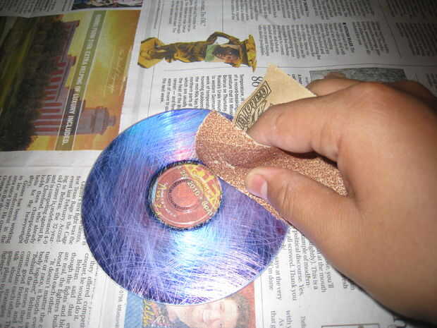 Tomar la lija y rayar por ambos DVDs. Esto proporcionará una mejor superficie para la pintura a pegarse a así como darle un aspecto más agradable de moda viejo que.