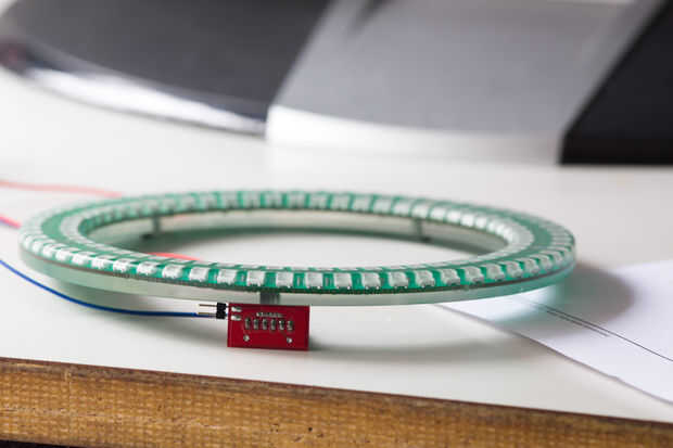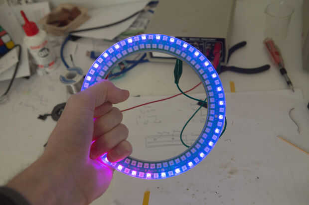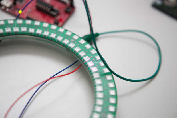 Aquí es donde se demostró otro problema. Un LED roto!!!! Había escrito un programa de prueba pequeña que mostraría un patrón en los LEDs cuando se aplica energía, este patrón ciclo aunque colores para decirme que todo estaba funcionando como se pretendía. Sin embargo sólo estuve probando cada segundo LED en el aro exterior. Una vez que había programado con el anillo interior que descubrí que trabajó sólo la primera mitad, la segunda mitad no mostrar nada. Extraño bastante, si el LED se alimenta de 3.6volts en vez de 5, datos pasaría a través de este LED, pero aún no muestra nada. Sin embargo los colores dados los LEDs son mucho mejores en 5v. así que decidí cortar mis pérdidas y sólo tiene que utilizar 60 LEDs de mi anillo.