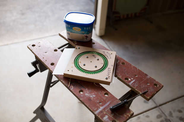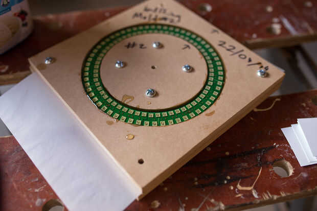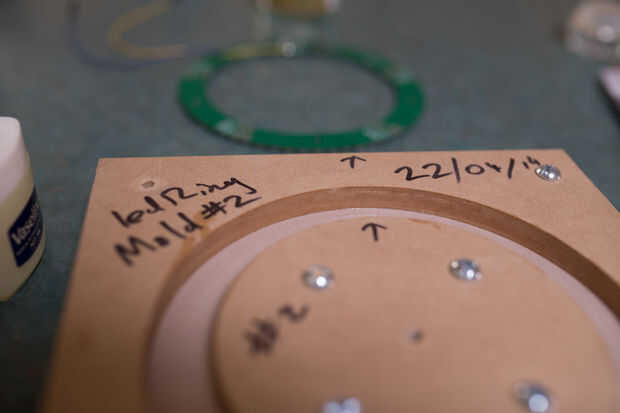 Verter una capa de resina a más de la mitad de la altura, entonces colocando el anillo en y girando lentamente mientras empuja hacia abajo reducirá las burbujas atrapadas debajo. Otra capa se vierte por encima de los LEDs lentamente, asegurando exceso burbujas no se forman, las burbujas en la resina que floten a la tapa y el pop con el tiempo. Una vez que la resina se vierte una aguja puede utilizarse para meter en el PCB y asegurar que esté centrada en el molde.