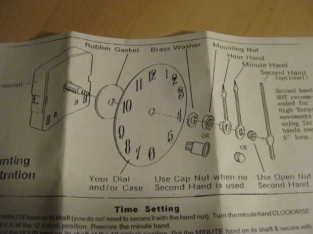 Colocar las manos y los frutos secos como lo indique el kit. Inserte la batería. Esta parte es simple. Usted puede incluso poner más pegamento en las juntas de deslizamiento (aguja de las horas en la mayoría de los kits es sólo un resbalón en)