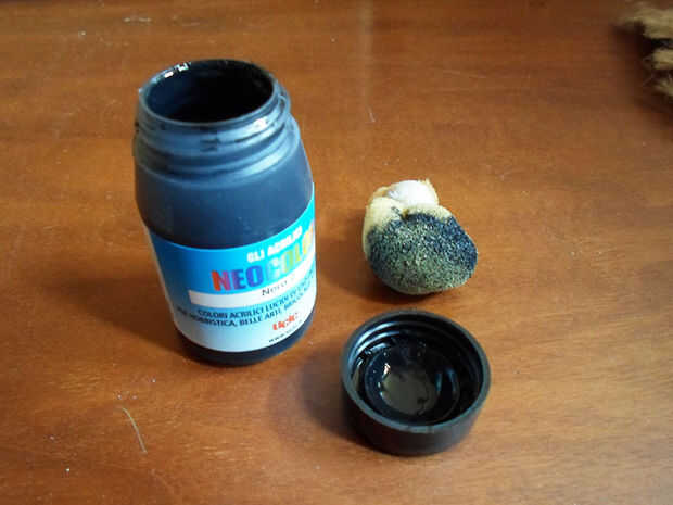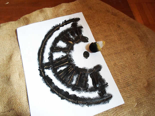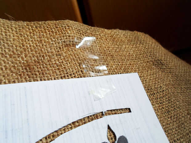 Finalmente pegar la plantilla a la arpillera usando cinta scotch y puntee en el reloj con pintura acrílica negra, para "estampar" su reloj en la pieza de arpillera. Puede utilizar un pedazo pequeño de esponja o espuma para hacerlo.