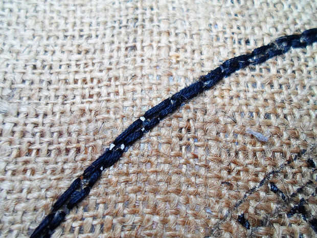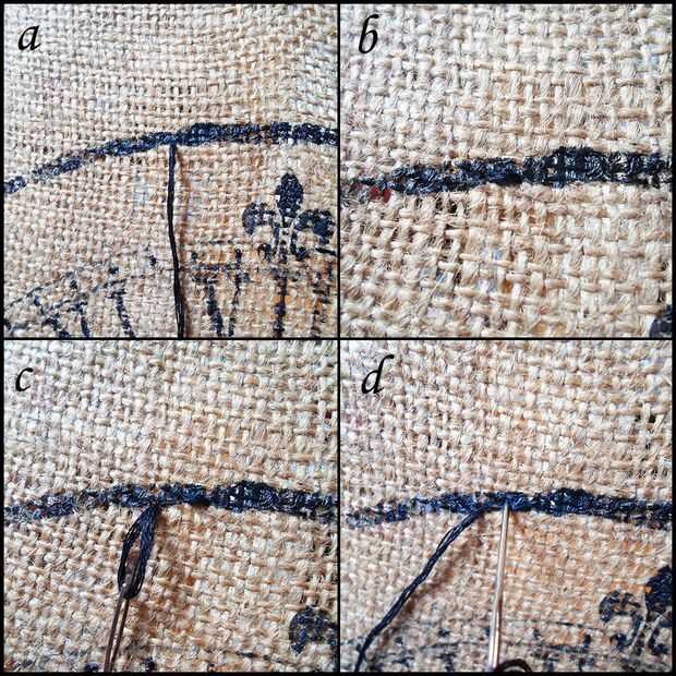Inserte la aguja a la izquierda otra vez, de la parte posterior de la arpillera y continuar como antes de hacer más segmentos uno tras otro, y completar la ronda. Los segmentos deben ser todos aproximadamente del mismo tamaño.