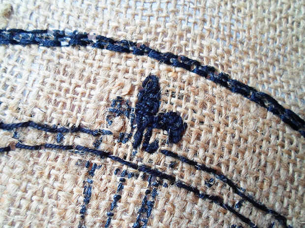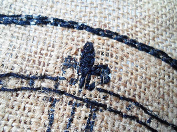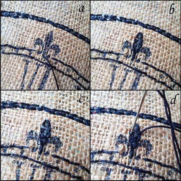 c. la parte posterior de la arpillera, inserte la aguja a la derecha del esquema y vuelva a insertarla a la izquierda para crear un segmento horizontal;