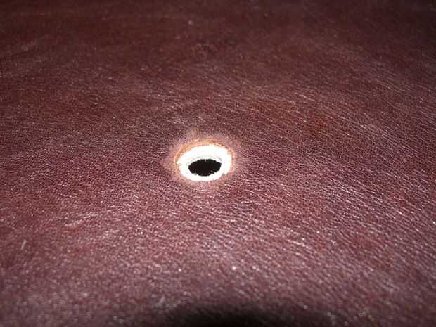 En primer lugar trabajar en el centro de tu rostro y un taladro, coloque la cara de reloj abajo sobre algo de madera, esto significa que el cuero tenga un corte limpio. (Foto 2 muestra el agujero en el lugar)