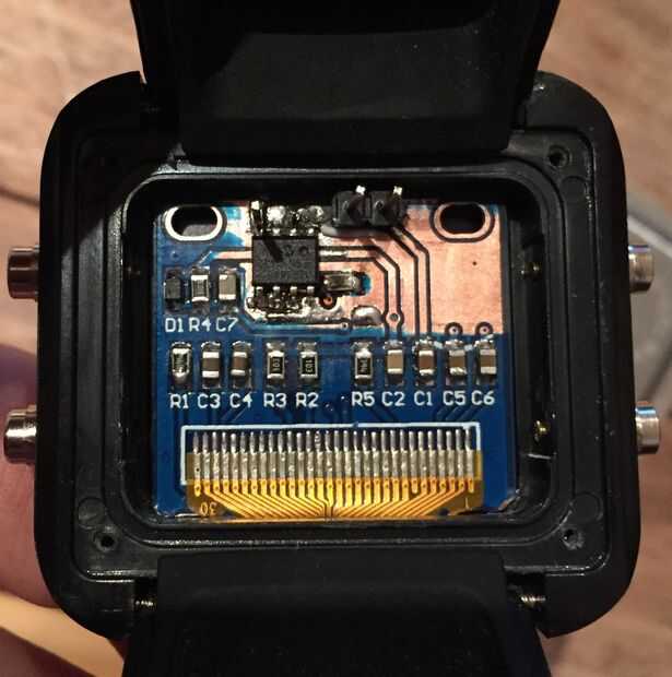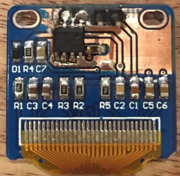 Ahora venía la parte difícil. Con OLED en la caja del reloj no había lugar para otros circuitos por lo que la foto tuvo que soldar en un área de repuesto de junta. Por suerte, la mayoría de la Junta es plano de tierra utilizando una cuchilla afilada que podría cortar el plano de tierra y hacer mis propio pads para soldar el PIC para y simplemente use cable delgado para conectar hasta los diferentes lugares que sea necesario.
