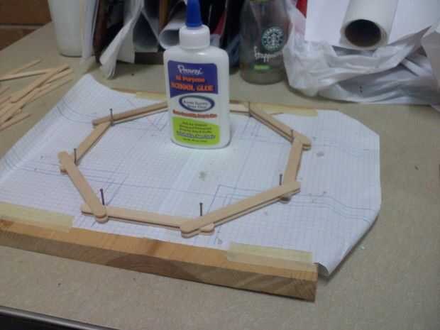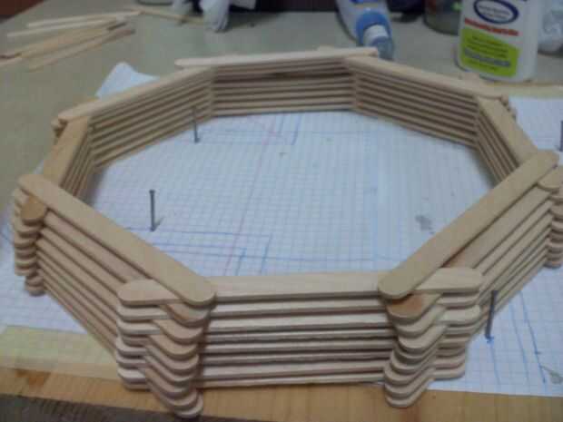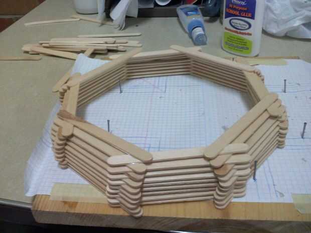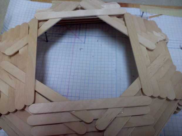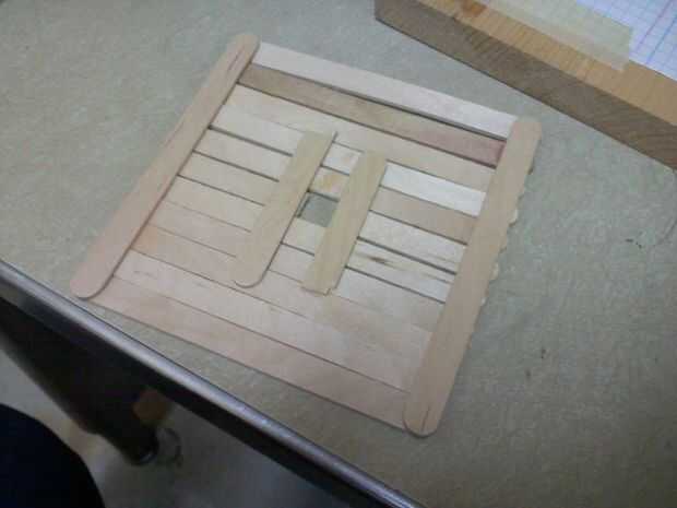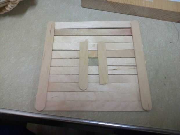 Ahora haces una sólida plataforma de palos para hacer la cara de reloj con un cuadrado cortado por el medio del palo medio (es más fácil hacerlo antes de pegarlos juntos), luego pegar dos mitades de la pega a la espalda para reforzarlo.