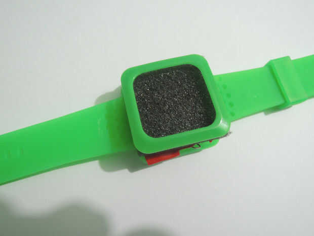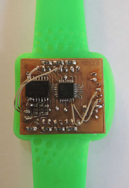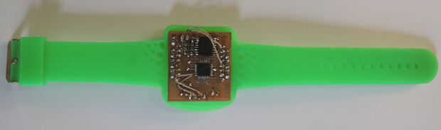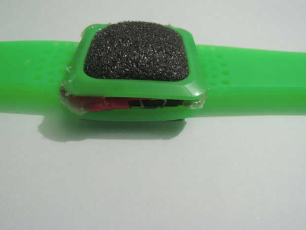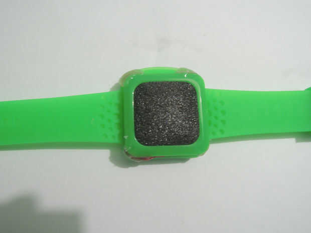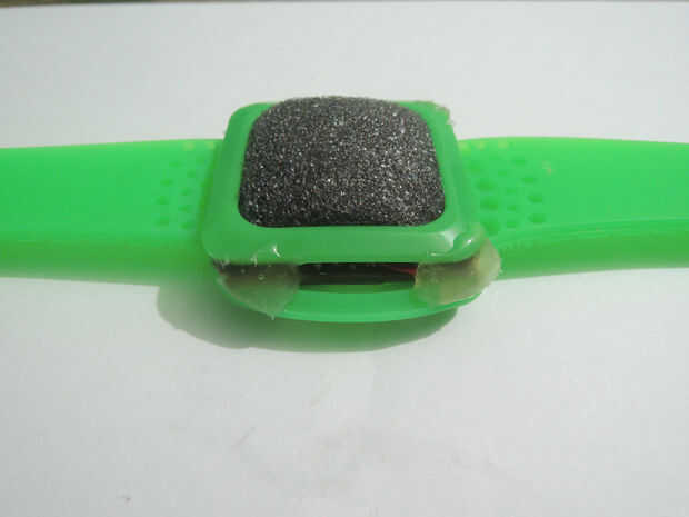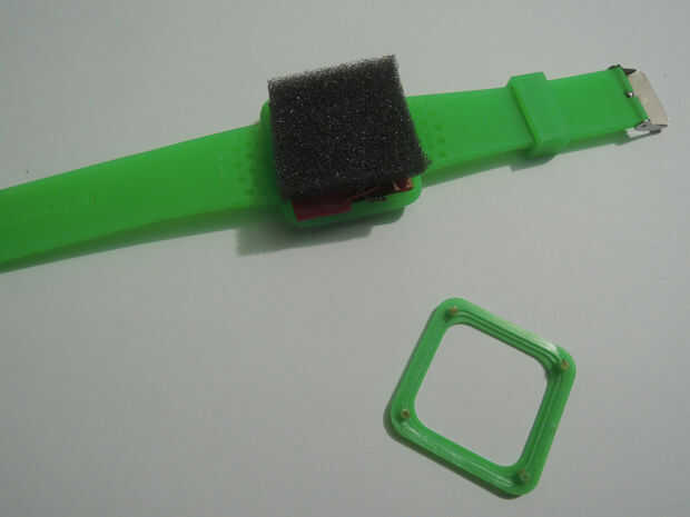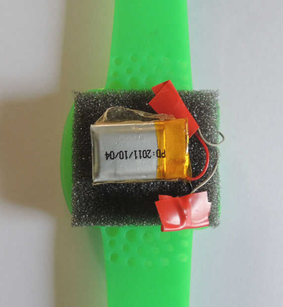 Nuestra obra está casi terminada. Se construyó el hardware y carga el programa. Ahora nos debemos fijar con venda de muñeca. Las imágenes muestran los pasos de la obra. Batería está separada del circuito por aislador. He utilizado pegamento caliente para fijar el marco inferior a la banda.