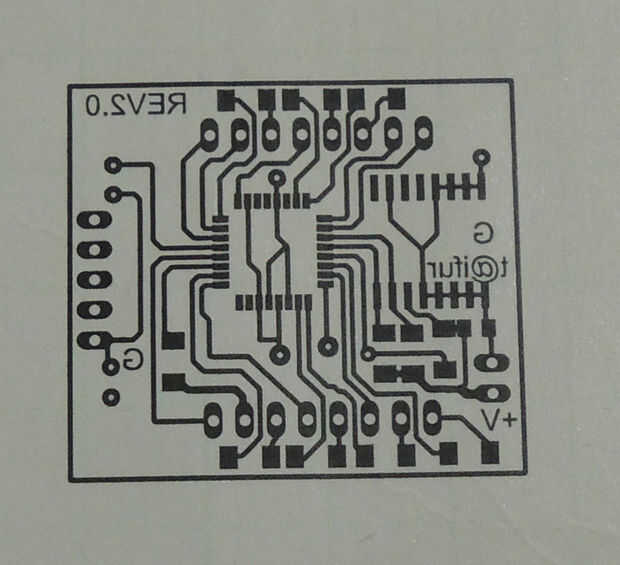 Fichero de la placa de águila y una versión en pdf se adjunta aquí. Desde el esquema ves dos condensador está conectado con el cristal pero no está presente en el pcb. Sin éstos el circuito funciona bien sin ningún problema.