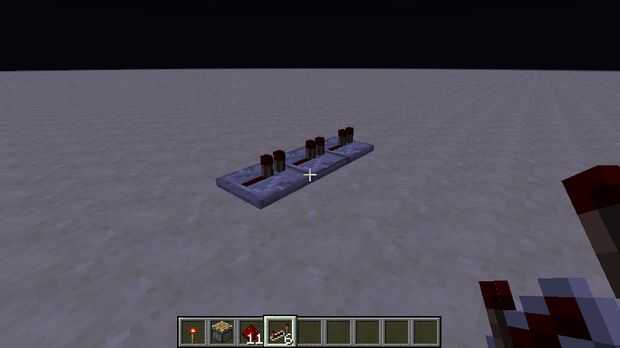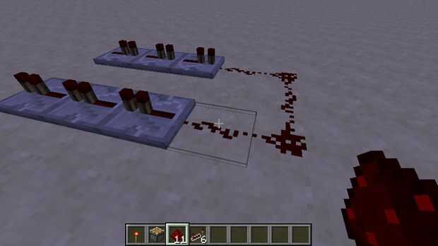 Coloque los siguientes tres repetidores junto a los tres primeros frente a la dirección opuesta (las dos antorchas en la parte superior deben estar en la dirección opuesta. Usted puede colocar estos bloques por orientados en la dirección opuesta al colocarlos), con separación de un bloque entre ellos. Todos deben enfrentarse a la misma (dirección opuesta) y tiene cero retraso.