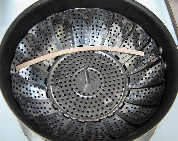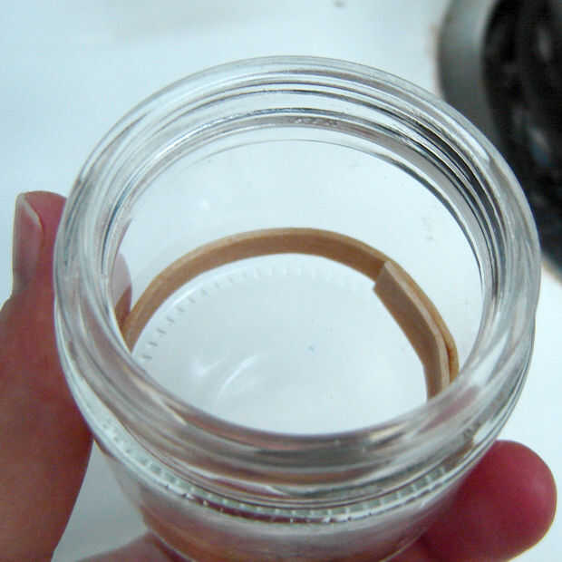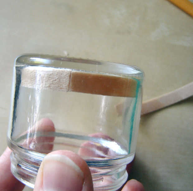 corté una tira de un centímetro de madera fina, era como un poco más grande que la circunferencia del interior de la jarra.   Con una olla de vapor de agua y vegetales al vapor la madera hasta que era capaz de doblarlo suficiente para caber dentro de la jarra.  Esto tomó aproximadamente 10-15 minutos.  Corte la madera extra para que los extremos se reunieron al ras.  Yo también manchada la madera usando un rotulador de color marrón diluido con alcohol.  Necesitaba trabajar rápidamente aquí como la madera estaba comenzando a ser menos flexible y difícil de caber en el frasco.  Una vez que la madera estaba lista cayó en la jarra y colocado cerca del borde inferior (había necesidad de pegamento, como la madera seca lo no estaba atascada en el lugar).