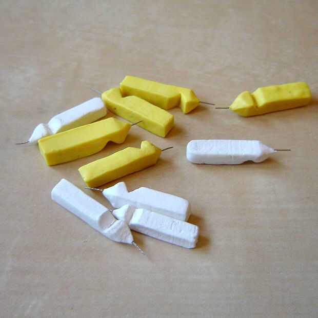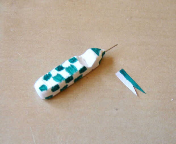 Una vez que los soportes de visualización son horneados y enfriados agregué los colores de la casa.  Para los stands amarillo hice 2 cuadros con marrón (Hufflepuff) y tres con rojo (Gryffindor).  Para el blanco hice 2 cuadros con azul (Ravenclaw) y 3 verde (Slytherin) *.  Las banderas sobre los soportes fueron hechas de papel de color blanco y verde, blanco y azul, amarillo y marrón y amarillo y rojo.  Solo estaban pegados al cable.