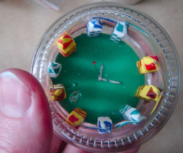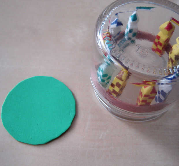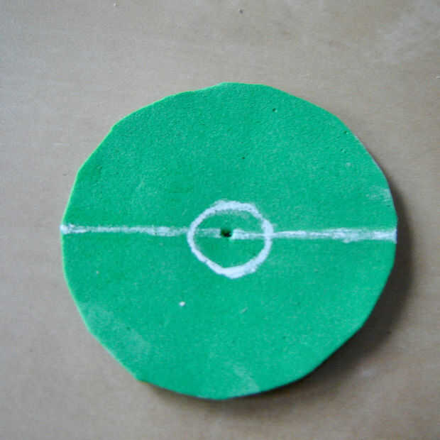 que había al principio planeada usar verde sentía por el tono ya que se vería más hierba-como, por desgracia era un poco demasiado gruesa que impide el movimiento de las agujas del reloj.  En cambio, he usado espuma de artesanía.  I cortar un círculo lo suficientemente pequeño como para caber dentro de la jarra, asomó un pequeño agujero en el centro para el mecanismo del reloj y dibujó las líneas en el campo con pintura blanca.