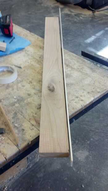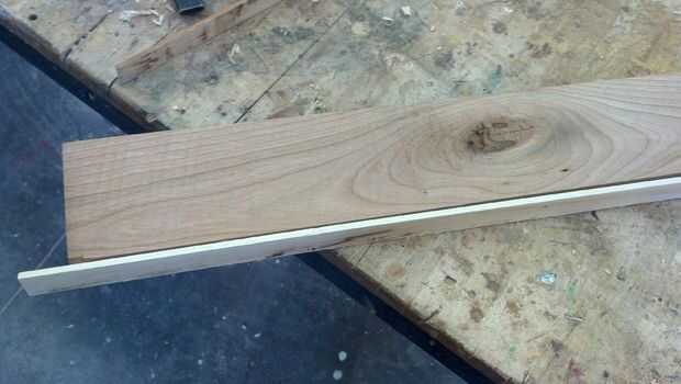 Corte una pieza de 3/4 de pulgada grueso cereza a 37" por 2" luego cortar ese trozo por la mitad. Cortar una tira fina de 37 by3/4 de pulgada pino una hoja gruesa para poner entre las dos piezas de cereza.