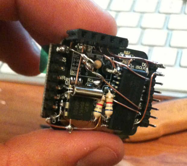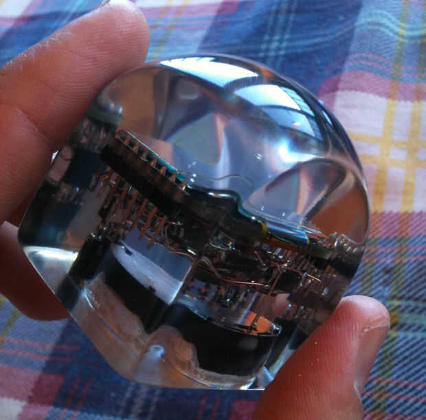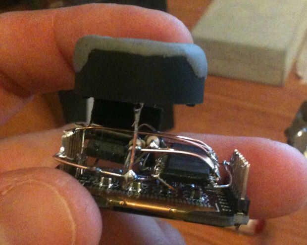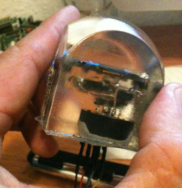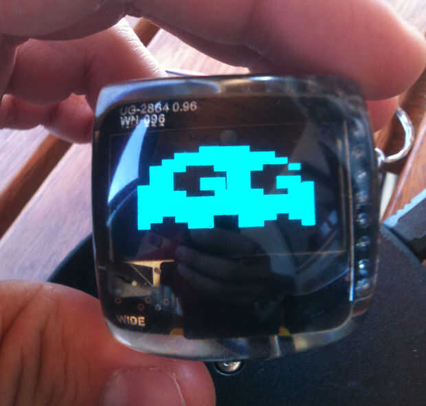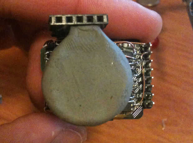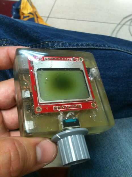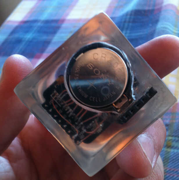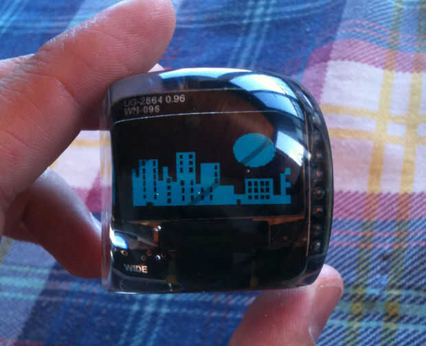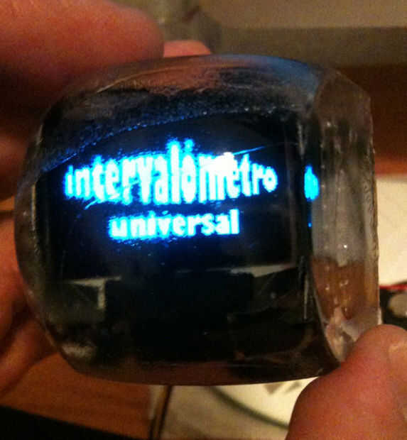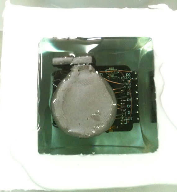 La segunda imagen fue el primer intento para una exhibición en resina de poliéster, debido a la resina puede llegar a alta temperatura durante el curado, un LCD no es la mejor opción. Este reloj fue hecho con una pantalla OLED.