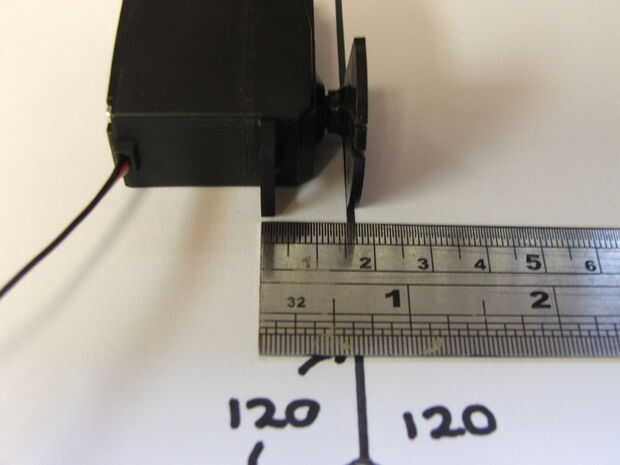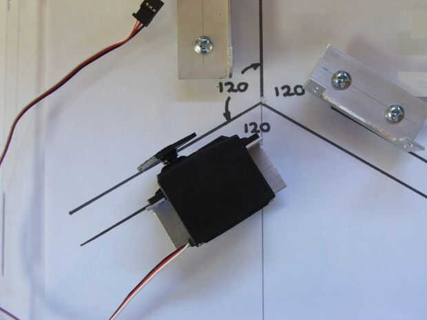 Los servos deben ser montados de manera que los cuernos servo son equidistantes del punto central y el centro del Baje el brazo cae a lo largo del eje. Para mi diseño esto significó el cuerno del servo alineado con el eje marcado.