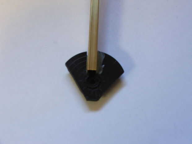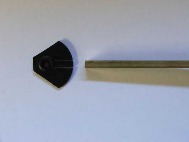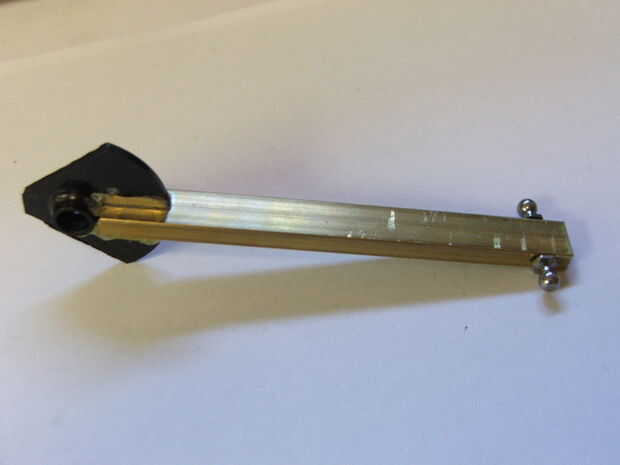 El otro extremo del brazo inferior debe conectar el servo. Para ello corté dos ranuras en un cuerno de control redondo grande que pude Deslice la sección rectangular en su lugar. Me fijo entonces el cuerno el brazo llenando el extremo del tubo de latón con epoxi.