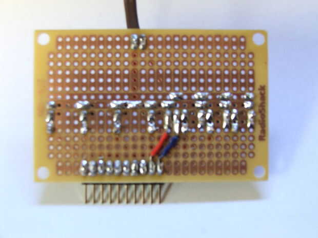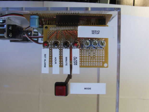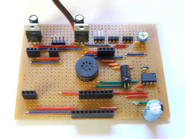 La energía es suministrada por dos 7805 reguladores, uno dedicado a la conducción de los servos mientras el otro proporciona la energía para el resto del circuito.
