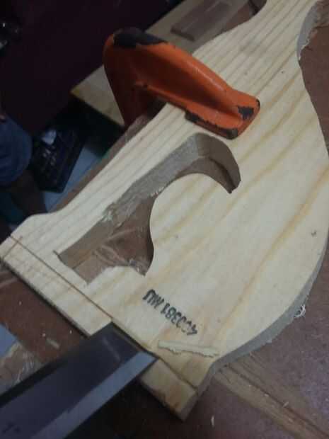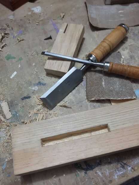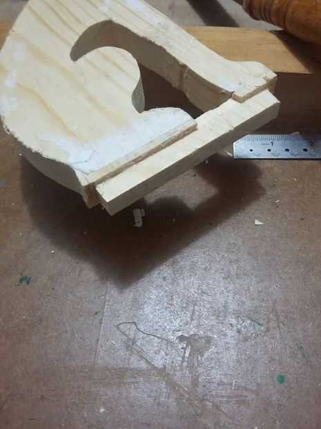 Decidí unir la silueta a la base mediante espiga y mortaja, así que utiliza el cincel para cortar una espiga y luego colocarla en la base para dibujar la mortaja. Tuve algunas para picar pero después que tuve la mortaja finalizada.