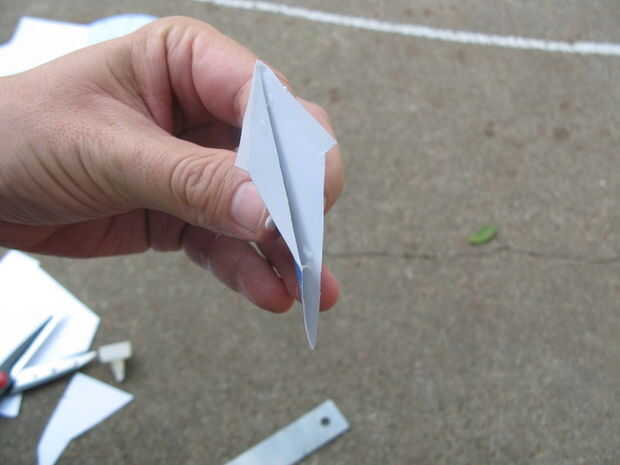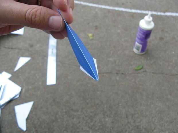 A continuación, pegar con cuidado a los dos triángulos a cada lado de la línea de doblez de montaña central, hasta los pliegues de valle que hice (Foto 3). No utilice demasiado pegamento, usted quiere un empalme muy plano y recta. Espere a que el pegamento fijar un poco antes del siguiente paso. Si desea que el gnomon para ser más fuerte, puede incrustar un cable extraído de un lazo de alambre a lo largo del pliegue.