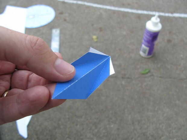 Por último, usted tiene dos pequeñas aletas que se usa para pegar el gnomon para el triangular (o, más precisamente, en forma de diamante) área de la esfera. Se unen con los dobleces de montaña--pliegue ellos se unen para arriba pero no se superponen (foto 4).