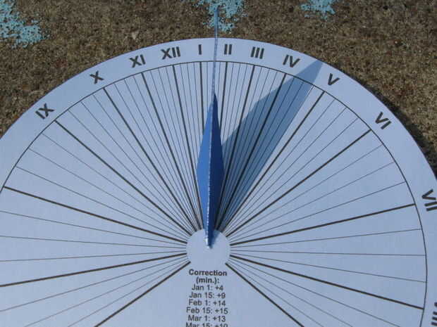 Para mayor precisión, puede Agregar el número de minutos indicado en la tabla de corrección para una fecha cerca de la fecha actual. Se trata de una corrección de la Ecuación del tiempo que cada reloj tiene que hacer. Si alineado y nivelado bien el dial (mina que bien alineado, no era el excelente partido con tiempo en la foto 1 era probablemente un golpe de suerte; en foto 2, tenía el dial--realmente una copia diferente de la esfera, en una ubicación ligeramente diferente).