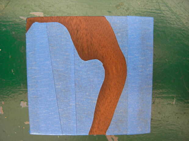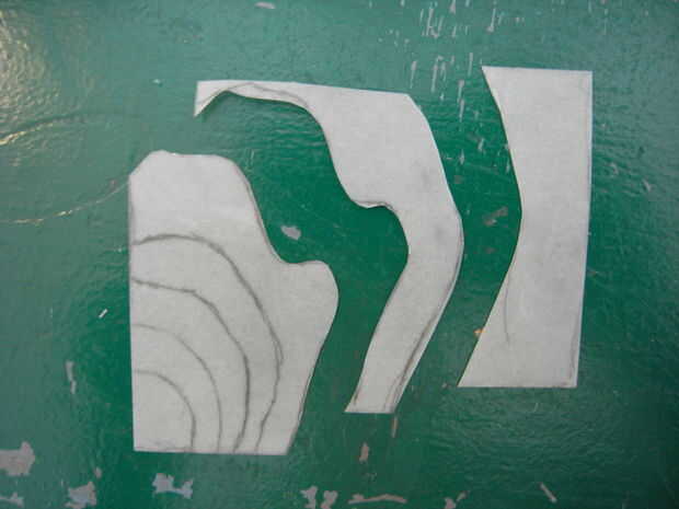 El patrón que hice en la parte superior se basó en el patrón natural de la madera. Pensé que parecía como un mapa topográfico y, desde un reloj de sol díptico es clase de náutica con temas de todos modos, pongo una X en la esquina donde anclada la cuerda. Papel de calco me permitió copiar el patrón del grano de madera de la parte superior del bloque, por lo que mi pintura puede ser precisa. Utilicé un papel vitela gruesa, que es lo suficientemente rígido que podría ser una guía para la cuchilla de corte.