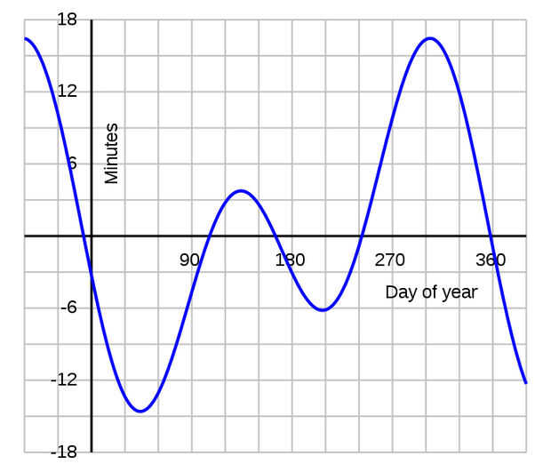 - Ecuación de corrección de tiempo: las lecturas del reloj de sol tendrán que restar o sumar tiempo debido a la órbita elíptica de la tierra (véase imagen).