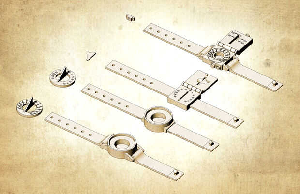 Diseño de la colección del reloj de reloj de sol, comencé en 2D, creando el contorno del cuerpo del reloj y banda. Entonces yo redacté las líneas de la hora y el gnomon de la Meridiana siguiendo los procedimientos delineados en el paso anterior. Entonces investigué los tamaños y tipos de brújulas para embutido antes de completar el modelado 3D. La venda de reloj y bisagras ligeramente contrarrestadas con un boquete, mientras que el texto negro es booleano del cuerpo sólido reloj. Esto es importante al preparar el archivo para una impresión 3D. .