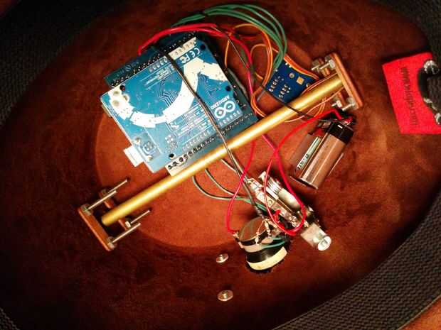 Todos estos están montados en la parte superior del sombrero, junto con el poder de sistema provee de la batería de 9 voltios. Te recomiendo conseguir tan alto de un sombrero de lo posible, ya que los componentes tienden a empujar mi cabeza un poco en ciertos ángulos. Hay un montón de habitación a cada lado de los ejes coaxiales, pero tendrás que ser un poco creativo para conseguir que todos caben. Asegúrese de que nada está frotando en los ejes, ya que necesitan girar libremente!
