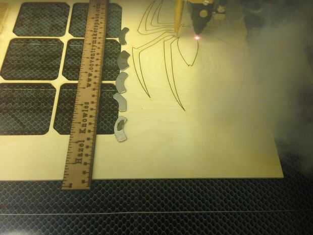 Cargar los archivos de lasercut en nuestra máquina láser encuentra el punto de referencia adecuado en capas, alineó el trabajo e inició una prueba de funcionamiento para asegurar el corte encajaría. Una vez que feliz corte la araña y el bueno de ver resultados.