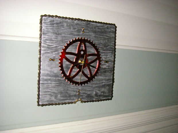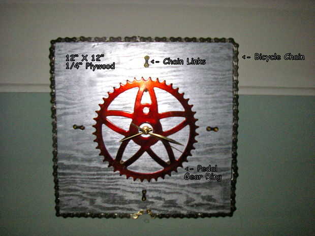 Cortar el trozo de 1/4" madera contrachapada bueno un lado 12" X 12" y pintarlo. Una vez seco, determinar el centro exacto y perfore un agujero para las obras del reloj. Encontrar un viejo pedal de una bicicleta de una velocidad (utilicé este tipo de anillo del engranaje porque tiene algunos caracteres). Limpiaron el anillo de engranaje y rociado con Krylon pintura metálica para darle un look anodizado.