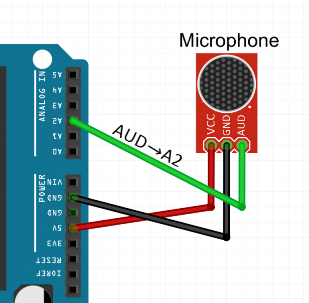 Para el micrófono, GND se conecta a tierra, VCC se conecta a 5V, y AUD conecta con A2.